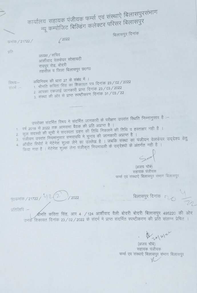 आशीर्वाद वैली निवासी कविता सिंह ने जब आशीर्वाद वैलफेयर सोसायटी की संपूर्ण जानकारी बिलासपुर संभाग के पंजीयक फर्म्स एवं संस्थाएं कार्यालय से जानकारी माँगी तो उनके द्वारा दिये गए जानकारी में आशीर्वाद वैलफेयर सोसायटी की बहुत सी अनियमितताओं का उजागर हुआ है।