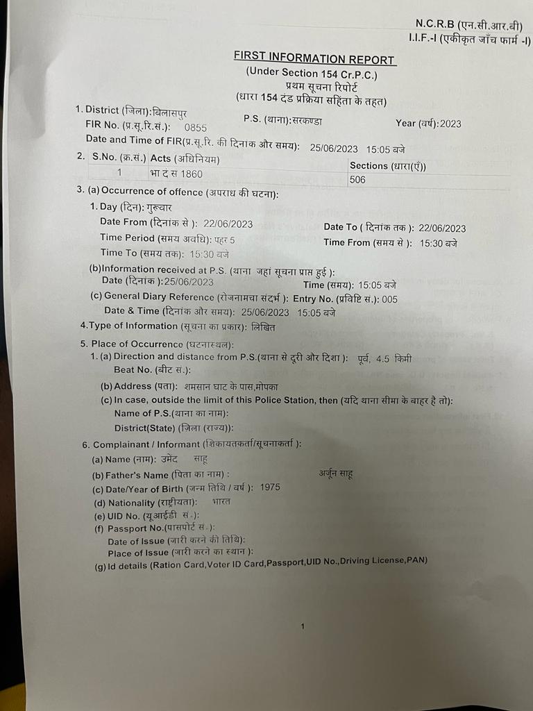राज भारत न्यूज / छत्तीसगढ़ / 25 जून 2023 / बिलासपुर :- युवा काँग्रेस जिला शहर अध्यक्ष शेरू असलम के खिलाफ आज सरकंडा थाना में किसान को धमकाने वाले मामले पर पुलिस ने धारा 506 के तहत एफआईआर दर्ज कर दिया है वही उक्त घटना के प्रार्थी किसान उमेंद्र साहू ने सरकंडा थाना प्रभारी फैजुल होदा शाह के खिलाफ़ वीडियो जारी कर शेरू असलम के ऊपर उचित कार्यवाही की माँग कर न्याय की गुहार लगाया है।