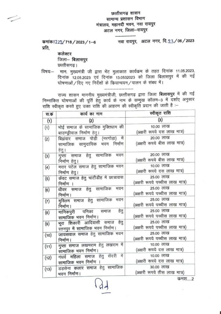 मुख्यमंत्री भूपेश बघेल के भेंट मुलाकात कार्यक्रम के तहत दिनांक 11, 12 और 13 मई को बिलासपुर जिले में की गई घोषणाओं पर आदेश जारी किया गया है। सामान्य प्रशासन विभाग ने बिलासपुर जिले के 43 समाजों को 9 करोड़ 25 लाख रुपए की स्वीकृति आदेश जारी कर दिए हैं।