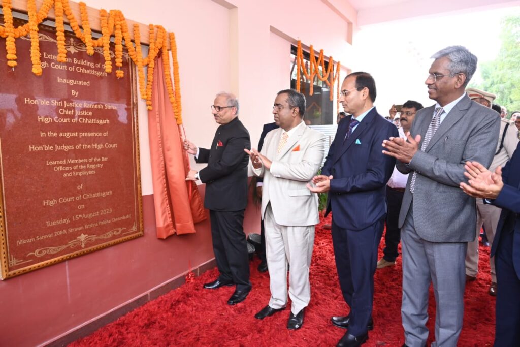 छत्तीसगढ़ उच्च न्यायालय बिलासपुर में विस्तार भवन निर्माण हुआ है जिसमें 07 अतिरिक्त कोर्ट रूम हैं। ध्वजारोहण के उपरांत मुख्य न्यायाधीश द्वारा नवनिर्मित विस्तार भवन एवं अतिरिक्त कोर्ट रूम साथ ही न्यायिक कार्यवाही की लाईव स्ट्रीमिंग, 22 जिलों के ई-सेवा केन्द्र, ई-गेट पास के संबंध में मोबाईल एप, ऑनलाईन रिकूटमेंट एप्लीकेशन का भी उद्घाटन किया गया। इस ऐतिहासिक अवसर पर यातायात संबंधी चालानों के संबंध में जिला अंबिकापुर, बिलासपुर, दुर्ग तथा जगदलपुर की वर्चुअल कोर्ट और न्यायिक अधिकारीगण के न्यायिक विमर्श के संबंध में साफ्टवेयर का भी उद्घाटन किया गया। इसी कड़ी में 04 नये टेलीग्राम चैनल का भी उद्घाटन किया गया। अब पक्षकारगण व आम जनता अपने प्रकरणों में हो रही सुनवाई को घर बैठे लाईव स्ट्रीमिंग के माध्यम से उच्च न्यायालय छत्तीसगढ़ की वेबसाईट में देख सकते हैं। उल्लेखनीय है कि आमजनों को कॉजलिस्ट, ए.एफ. आर. जजमेंट, महत्वपूर्ण सूचनाएँ और निविदाओं की जानकारी पूर्व से ही वेबसाईट से प्राप्त हो रही है। उच्च न्यायालय द्वारा जारी अधिसूचना के अनुसार दिनांक 16.08.2023 से नवनिर्मित विस्तार भवन में कोर्ट रूम क्रमांक 17 एवं 18 में न्यायमूर्ति अरविंद सिंह चंदेल एवं न्यायमूर्ति संजय कुमार जायसवाल द्वारा प्रकरणों की सुनवाई प्रारंभ कर दी गयी है। यह भी उल्लेखनीय है कि मुख्य न्यायाधीश रमेश सिन्हा साहब द्वारा नवनिर्मित विस्तार भवन में कोर्ट रूम क्रमांक 16 में प्रति शुक्रवार को द्वितीय पाली में दोपहर 2.15 बजे से प्रकरणों की सुनवाई प्रारंभ की जावेगी। उक्त समारोह छत्तीसगढ़ उच्च न्यायालय के न्यायमूर्तिगण, सेवानिवृत्त न्यायमूर्तिगण रजिस्ट्रार जनरल, महाधिवक्ता व शासकीय अधिवक्तागण, उच्च न्यायालय व जिला न्यायालय के बार एसोसियेशन के सदस्य, रजिस्ट्री के अधिकारी व कर्मचारीगण एवं बिलासपुर जिला न्यायालय के न्यायिक अधिकारीगण की गरिमामयी उपस्थिति में सम्पन्न हुआ। इस ऐतिहासिक अवसर पर उच्च न्यायालय परिसर के आस पास के ग्रामों के निवासी एवं स्कूली बच्चों का अभूतपूर्व उत्साह देखने को मिला। इस समारोह में स्वस्फूर्त 5000 से भी अधिक संख्या में लोग शामिल हुये। स्वतंत्रता दिवस के उपलक्ष्य में उच्च न्यायालय भवन आकर्षक प्रकाश व्यवस्था से सुसज्जित किया गया था।