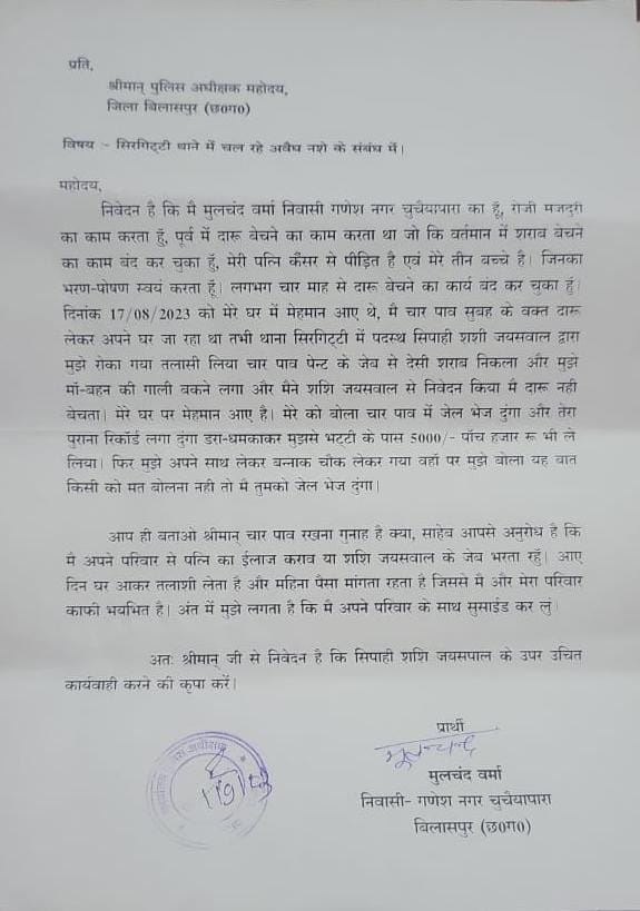 गणेश नगर निवासी मूलचंद जो पहले खुद अवैध नशे का कारोबार करता था,उसने एसपी कार्यालय पहुंचकर लिखित शिकायत करते हुए बताया कि वे पूर्व में शराब बेचता था।लेकिन बे समय से बन्द कर दिया है।उसकी पत्नी केंसर से जुझ रही है।3 बच्चों के साथ जैसे तैसे कामकाज करके जीवन यापन करता है।कुछ दिन पहले उसके घर मे मेहमान आये थे।जिनके लिए वे शराब भट्टी से 4 पाव शराब लेकर घर जा रहा था।तभी भट्टी के पास ही सिरगिट्टी थाने में पदस्थ शशि जायसवाल द्वारा उसे रोककर पैसे की मांग की गई।नही देने के एवज में उसे धमकाते हुए सिपाही शशि ने कहा कि तेरा पुराना रिकॉर्ड निकालकर तुझे जेल भेक दूंगा।नही तो तुरंत 5 हजार रुपये दे।मरता क्या ना करता उसने तत्काल 5 हजार रुपये दे दिए।पीड़ित का आरोप है कि शशि आएदिन उसके घर पहुंचकर जबरिया तलाशी लेता है और पैसे की मांग करता है।नही देने पर फंसाने की धमकी देता है।इससे वे और उसका परिवार भयभीत है।पीड़ित मूलचंद ने लिखित शिकायत करते हुए एसपी साहब से निवेदन करते हुए दागदार सिपाही के खिलाफ सख्त कार्यवाही करने अपील की है।