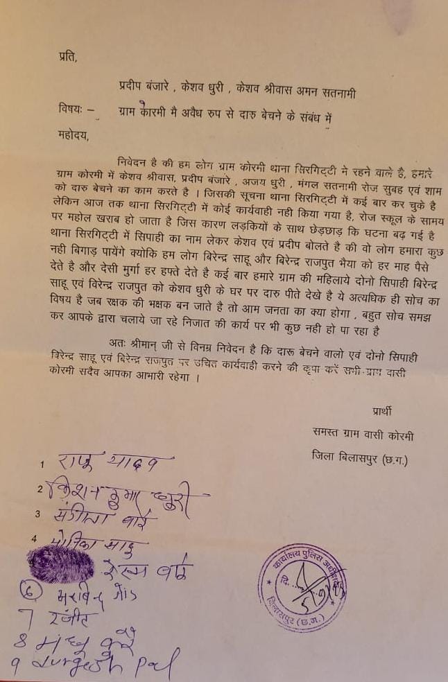 कोरमी के किसन कुमार धुरी,राजू यादव,संगीत बाई,मोनिका साहू,रेशम बाई,अरविंद गोंड़, रणजीत कुर्रे सहित तकरीबन एक दर्जन ग्रामीणों ने एसपी कार्यालय पहुंचकर लिखित शिकायत करते हुए बताया कि केशव श्रीवास,प्रदीप बंजारे,अजय धुरी और मंगल कुमार की ओर से लम्बे समय से चौबीसों घण्टे अवैध रूप से शराब बेचने का कारोबार किया जा रहा है।इसके चलते क्षेत्र का माहौल खराब होता जा रहा है।शराबी स्कूली बच्चों से लेकर आते जाते महिलाओं से गाली गलौच कर सरेराह छेड़खानी करते है वहीं सामान्य लोगों से मारपीट भी करते है।क्षेत्रवासियों ने इसकी लिखित शिकायत भी कई बार सिरगिट्टी थाने में की।लेकिन किसी तरह का कोई कार्यवाही नही हुआ।बल्कि इसका विरोध करने पर ग्रामीणों को खुद नशे का कारोबार करने वाले धमकाते चमकाते है।और कहते है हमारा कोई कुछ नही बिगाड़ सकता है।हम हर महीने सिरगिट्टी थाने के सिपाही बीरेंद्र साहू और वीरेंद्र राजपूत को पैसे देते है।ग्रामीणो का आरोप है कि वे खुद देखें है कि सिपाही वीरेंद्र साहू व वीरेंद्र राजपूत नशे का कारोबार करने वालों के यहां बैठकर शराबखोरी करने के साथ मुर्गा पार्टी भी करते है।