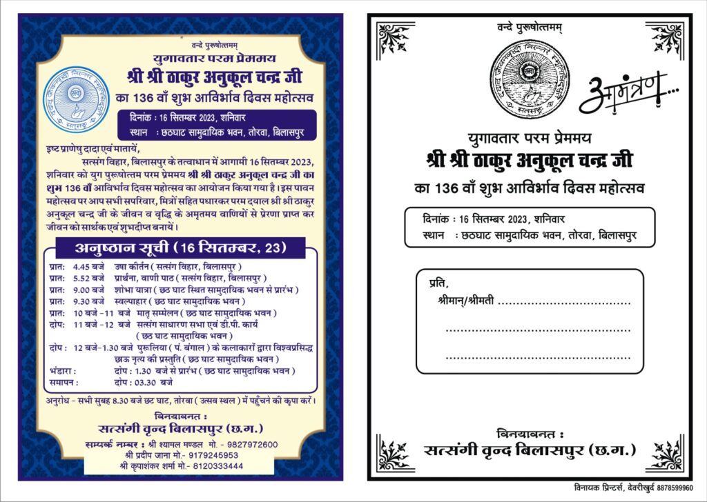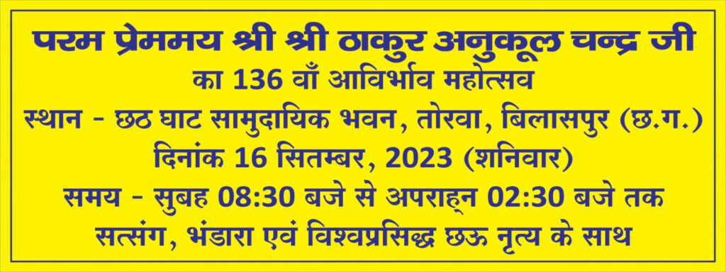 राज भारत न्यूज़ / छत्तीसगढ़ / 14 सितंबर 2023 / गुरुवार / बिलासपुर :- परम प्रेममय परम दयाल युग पुरषोत्तम गुरुदेव श्री श्री ठाकुर अनुकूल चंद्र जी का 136 वाँ एक दिवसीय आविर्भाव दिवस महोत्सव 16 सितंबर को छठघाट स्थित सामुदायिक भवन में भव्य रूप से मनाया जाएगा।जिसमे जिले के सभी क्षेत्रों से भक्त वृन्द इस महोत्सव में उमड़ेंगे अपने गुरु के सत्संग व पूजा अर्चना के लिए। यह महोत्सव शंकर नगर सत्संग विहार बिलासपुर द्वारा आयोजित हो रहा है जिसकी तैयारी पूर्ण कर ली गई है। महोत्सव के आयोजक प्रमुख ऋत्विक डॉ. मानस मिश्रा ने बताया कि गुरुदेव श्री श्री ठाकुर अनुकूल चंद्र जी का जन्म 14 सितंबर 1888 को वर्तमान बांग्ला देश के पाबना हिमायत पूर गाँव मे हुआ था लेकिन अपनी दिव्य लीला व अद्भुत ज्ञान से श्री श्री ठाकुरजी मानव जीवन का कल्याण किये। देश आजादी से पूर्व महात्मा गाँधी कलकत्ता में व लाल बहादुर शास्त्री जैसे विभूतियों ने उनका दर्शन करने उनके आश्रम देवघर पहुँचे जहाँ उनका दर्शन लाभ पाकर स्वयं को धन्य समझे।विश्व के सभी जगहों पर श्री श्री ठाकुरजी के अनुयायियों द्वारा पाबना से देवघर 2 सितंबर 1946 को उनके आगमन दिवस पर उनका आविर्भाव दिवस धूम धाम से 16 सितंबर को मनाया जाता है, बिलासपुर सत्संग विहार भी उक्त महोत्सव का भव्य आयोजन छठघाट में 16 सितंबर को कर रही है।