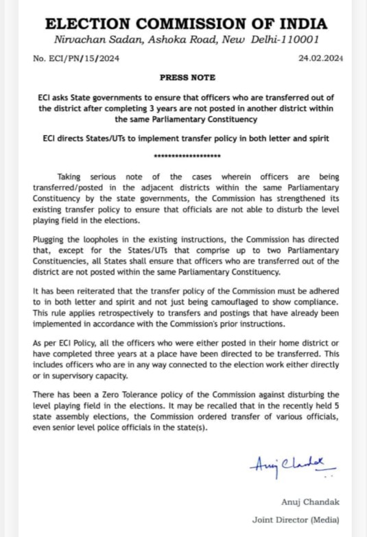 राज भारत न्यूज़ / नई दिल्ली / 26 फरवरी 2024 / सोमवार / दिल्ली सिटी -: देश भर में होने वाले लोकसभा चुनाव को ध्यान में रखते हुए भारत निर्वाचन आयोग ने सभी राज्य सरकार को निर्देशित कर सूचना पत्र जारी किया है जिसमें उल्लेखित है कि तीन वर्ष से अधिक अवधि तक कार्यरत शासकीय कर्मचारी व अधिकारियों के तबादले किये जाए। खासकर जो एक ही लोक सभा क्षेत्र में तीन वर्षों से पदस्थ है उनका विशेष तौर पर सूची बनाकर आयोग के निर्देश पर स्थानांतरण होंगे हालाँकि वर्तमान में जिन राज्यों में विधानसभा चुनाव हुए है वहाँ चुनाव आयोग के मापदंड के अंतर्गत आने वाले अधिकारी व कर्मचारियों की जनसंख्या कम रहेगी । बता दें कि छत्तीसगढ़ राज्य में पुरानी व नई सरकार ने बीते पाँच माह में दो सौ से अधिक अखिल भारतीय सेवा व राज्य सेवा अधिकारियों के तबादले कर दिए है लेकिन पुनः एकबार आयोग के निर्देशानुसार एक बार फिर 15 दिनों के अंदर उक्त अधिकारियों के तबादले हो सकते है क्योंकि अचार संहिता 10 मार्च के आसपास लागू हो जाएँगे।
