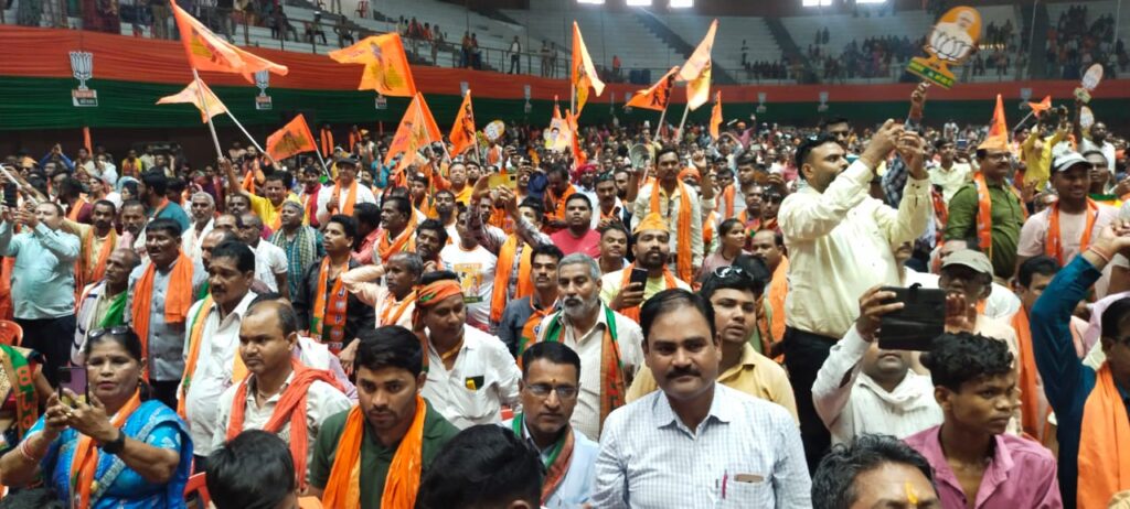 सरकंडा के बहतराई स्टेडियम में आज अपने चहेते नेता योगी आदित्यनाथ को देखने भाजपा के कार्यकर्ताओं सहित जन सैलाब उमड़ पड़ा सभी जय जय कारों के साथ योगी आदित्यनाथ का अभिनंदन कर रहे थे पूरा स्टेडियम खचाखच भरा हुआ था और उनके स्वागत में तालियों की गड़गड़ाहट गूँज रही थी।