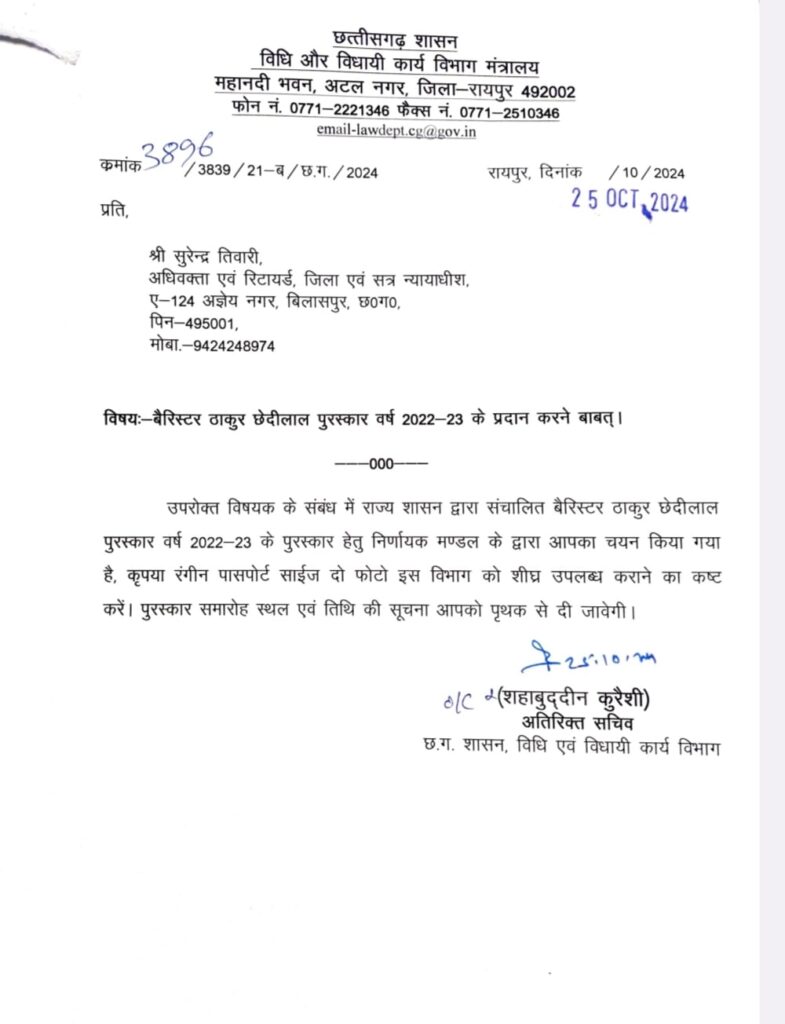 राज भारत न्यूज़ / छत्तीसगढ़ / 28 अक्टूबर 2024 / सोमवार / बिलासपुर / सिटी :- अज्ञेय नगर निवासी रिटायर्ड ज़िला एवं सत्र न्यायाधीश सुरेन्द्र तिवारी को वर्ष 2022-23 के लिए ” बैरिस्टर ठाकुर छेदीलाल सम्मान” पुरस्कार देने का निर्णय छत्तीसगढ़ शासन द्वारा लिया गया है। इस आशय की घोषणा विधि विभाग द्वारा दिनांक 25.10.2024 को जारी पत्र में की गई है। यह सम्मान/पुरस्कार विधि के क्षेत्र उत्कृष्ट कार्य/सेवा के लिए प्रदान किया जा रहा है।सम्मान- पत्र के साथ नगद राशि एक लाख रुपए दी जाएगी ।उल्लेखनीय है कि पिछले कई वर्षों से श्री तिवारी निःशुल्क कानूनी सलाह के साथ सिविल जज परीक्षा हेतु निःशुल्क मार्गदर्शन भी देते आ रहे हैं।वे बिलासपुर स्थित न्यायिक अकादमी में कानूनी विषयों पर 50 से भी अधिक निःशुल्क व्याख्यान न्यायाधीशों के बीच दे चुके हैं ।उनके द्वारा लिखी गई पुस्तक ” सुप्रीम कोर्ट ऑन नारकोटिक ड्रग्स ” को न्यायाधीशों, अधिवक्ताओं और अभियोजकों द्वारा काफी सराहा गया है।आगामी 6 नवंबर को नवा रायपुर में आयोजित समारोह में यह सम्मान/पुरस्कार प्रदान किया जायेगा।