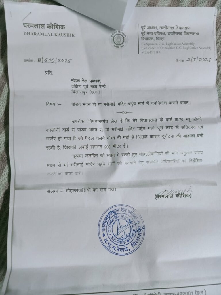 जनप्रतिनिधी वार्ड 70 त्रिपुर सुंदरी के पार्षद आर.श्रीनू व जय बूढ़ादेव वार्ड नं 12 के पार्षद विजय सिंह मरावी सहित क्षेत्र के नागरिक दिनेश पाठक,रमेश साहू,द्रोण साहू,सोमनाथ पाण्डेय एवं क्षेत्रवासियों द्वारा व्यवस्थित सड़क निर्माण हेतु मंडल रेल प्रबंधक के नाम ज्ञापन सौंपा व जल्द से जल्द नव सड़क निर्माण हेतु आग्रह निवेदन किये।