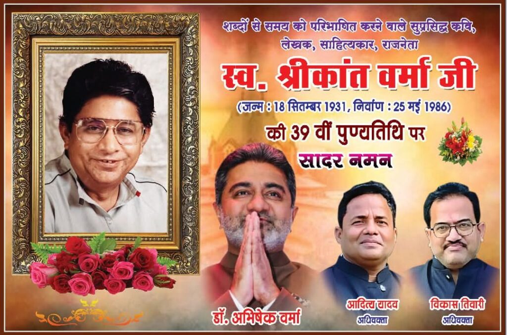 राज भारत न्यूज़ / छत्तीसगढ़ / बिलासपुर / सिटी समाचार -: बिलासपुर के वरिष्ठ एक युगद्रष्टा साहित्यकार,ओजस्वी कवि,निर्भीक पत्रकार और सिद्धहस्त राजनेता स्व श्रीकांत वर्मा जी की 39 वी पुण्यतिथि पर उनके विचारों और योगदान को नमन करते हुवे छतीसगढ़ भवन के पास स्व. श्रीकांत वर्मा की प्रतिमा के पास श्रंद्धाजलि सभा का आयोजन किया गया जिसमे शहर के सभी प्रबुद्धजन सहित कांग्रेसी उपस्थित रहे व स्व. श्रीकांत वर्मा के कार्यों सहित योगदान पर बारी बारी प्रकाश डाले जिसमे मुख्य रूप से कालीचरण यादव, विजय पांडे, राकेश शर्मा, रामशरण यादव, कृष्ण कुमार यादव, राजेश सोनथलिया, आदित्य यादव, सुभाष ठाकुर, रेवती यादव, जफर अली, सुनील यादव, सुकुमार यादव, प्रियंका यादव, स्वर्णा शुक्ला, मनोज शर्मा