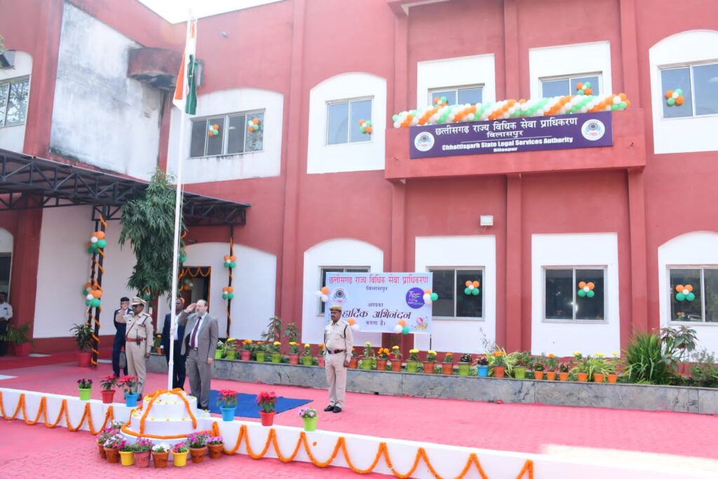 छत्तीसगढ़ / 26 जनवरी 2023 / बिलासपुर -: गणतंत्र दिवस के पावन पर्व पर छत्तीसगढ़ राज्य विधिक सेवा प्राधिकरण, पुराना उच्च न्यायालय भवन, बिलासपुर के प्रांगण में न्यायमूर्ति अरूप कुमार गोस्वामी, मुख्य न्यायाधीश, छत्तीसगढ़ उच्च न्यायालय एवं मुख्य संरक्षक, छत्तीसगढ़ राज्य विधिक सेवा प्राधिकरण के द्वारा ध्वजारोहण किया गया।