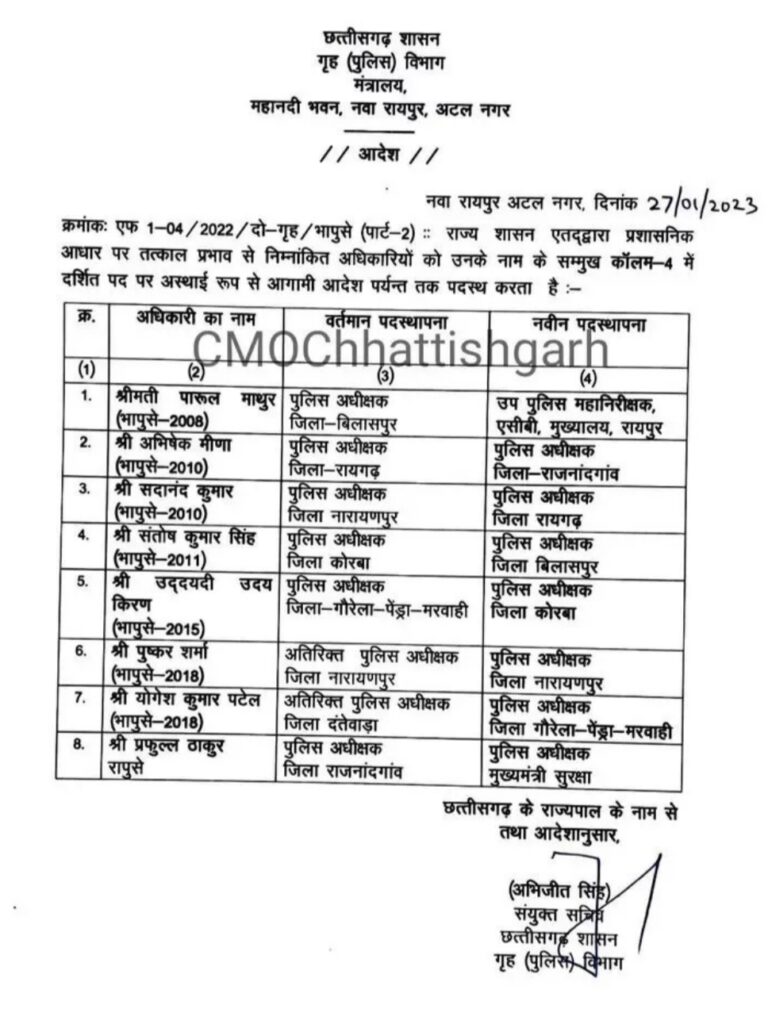 छत्तीसगढ़ / 28 जनवरी 2023 / बिलासपुर :- छत्तीसगढ़ में बड़े पैमाने पर आईपीएस अधिकारियों का तबादला किया गया है बिलासपुर रायगढ़ कोरबा समेत कई जिलों के एसपी को इधर से उधर किया गया है बिलासपुर एसएसपी पारुल माथुर को पुलिस महानिरीक्षक एसीबी मुख्यालय की जिम्मेदारी सौंपी गई है वही संतोष सिंह को कोरबा से बिलासपुर की जिम्मेदारी सौंपी गई है वही योगेश कुमार पटेल को दंतेवाड़ा से गौरेला पेंड्रा मरवाही की जिम्मेदारी सौंपी गई है इसी तरह प्रफुल्ल ठाकुर को पुलिस अधीक्षक राजनांदगांव से मुख्यमंत्री सुरक्षा पुलिस अधीक्षक की जिम्मेदारी सौंपी गई है।