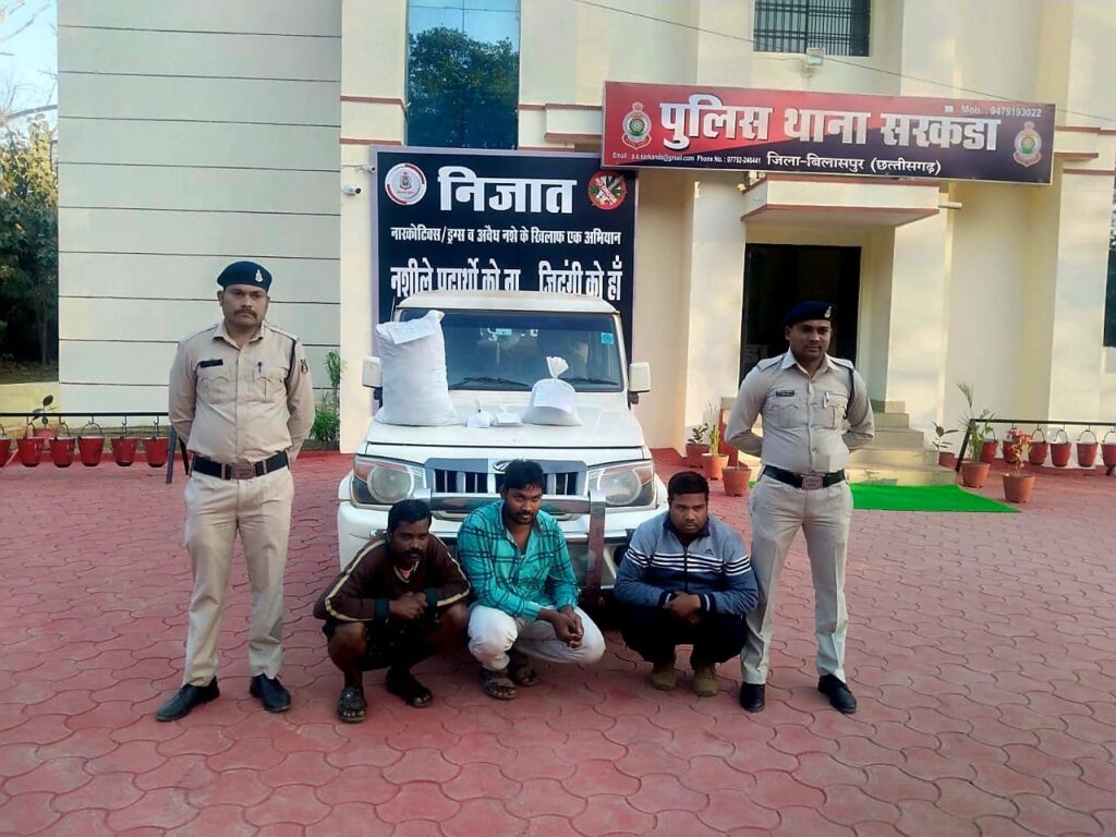 पुलिस अधीक्षक बिलासपुर संतोष कुमार सिंह (भा.पु.से.) के द्वारा जिले में नशे के कारोबार पर अंकुश लगाने एवं जिला को नशामुक्त करने हेतु निजात अभियान चलाया जा रहा है जिसके परिपालन में अति०पुलिस अधीक्षक शहर बिलासपुर राजेन्द्र जायसवाल एवं सी. एस. पी. (सरकंडा ) पूजा कुमार के निर्देशन में थाना प्रभारी सरकंडा फैजुल होदा शाह के हमराह में सरकंडा पुलिस के द्वारा नशे के कारोबार पर अंकुश लगाने हेतु विशेष अभियान चलाया गया । इस अभियान के दौरान जरिये मुखबिर सूचना मिली कि सफेद रंग के बोलेरो वाहन में कुछ व्यक्ति गांजा लेकर जा रहे है सूचना पर वरिष्ठ अधिकारियो को अवगत कराकर निर्देशानुसार पुलिस मौके पर पहुंची और छठघाट पुल के पास घेराबंदी कर आरोपियो को पकड़ा गया जिनकी तलाशी दौरान आरोपियो के कब्जे से 10 किग्रा. मादक पदार्थ गांजा, 02 नग मोबाईल तथा घटना में प्रयुक्त बोलेरो वाहन जप्त किया गया है। आरोपियो के विरूद्ध 20 बी एनडीपीएस एक्ट के प्रावधानों के तहत अपराध पंजीबद्ध कर कार्यवाही की जाकर आरोपियो को गिरफतार कर न्यायालय पेश किया गया है । उक्त कार्यवाही में थाना प्रभारी फैजुल होदा शाह सउनि प्रदीप यादव, म.प्र.आर.