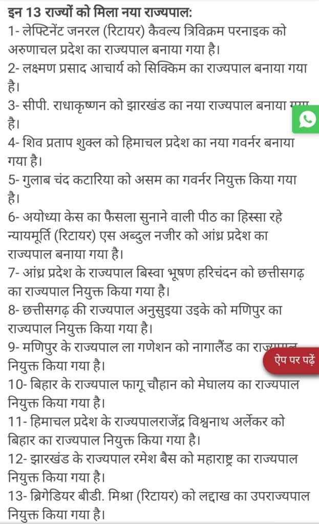 छत्तीसगढ़ / 12 फरवरी 2023 / बिलासपुर :- भारत की राष्ट्रपति द्रोपदी मुर्मू ने महाराष्ट्र के राज्यपाल भगत सिंह कोश्यारी व लद्दाख के उप राज्यपाल राधा कृष्णन माथुर के स्तीफा को मंजूर कर बड़े पैमाने पर राज्यपालों की नियुक्ति को मंजूरी दे दी है। छत्तीसगढ़ , बिहार , झारखंड सहित कई राज्यों के गवर्नर बदले गए है वही पर अयोध्या केस सुनवाई करने वाले व फैसला सुंनाने वाले पीठ का हिस्सा रहे सेवा निवृत्त न्यायाधीश अब्दुल नजीर को आंध्र प्रदेश का राज्यपाल नियुक्त किया गया है।