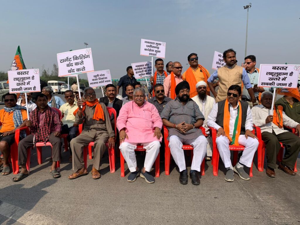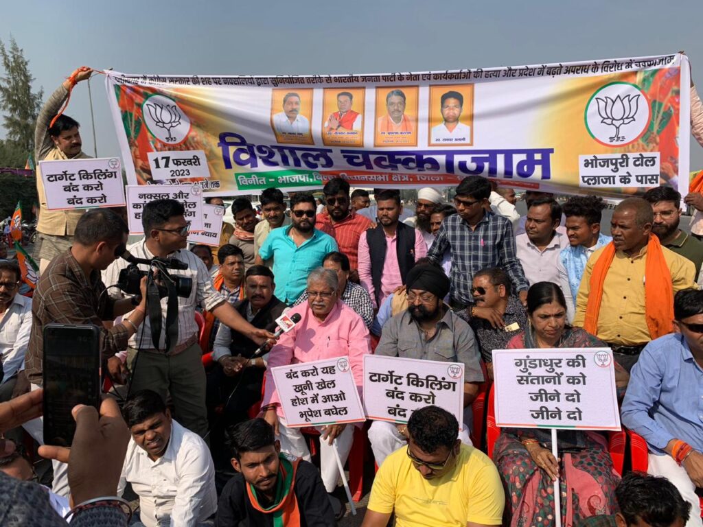 छत्तीसगढ़ / 17 फरवरी 2023 / बिलासपुर :- बिलासपुर आदिवासी नेताओ की हत्या के खिलाफ बीजेपी ने प्रदेशभर में चक्का जाम किया है ।बिल्हा में पूर्व नेता प्रतिपक्ष धरमलाल कौशिक ,प्रदेश उपाध्यक्ष भूपेंद्र सवन्नी सहित सैकड़ों की संख्या में कार्यकर्ता सड़क पर बैठ गए सरकार विरोधी नारों के साथ नक्सलियों द्वारा आदिवासी नेताओं का जमकर विरोध कर रहे है। हाथ मे सरकार विरोधी तख्ती लिए भाजपा कार्यकर्ता सड़क पर उतरे गए। पूर्व नेता प्रतिपक्ष ने कहा कि हत्या के खिलाफ लोगो मे आक्रोश है अगर इसपर लगाम नही लगी तो बीजेपी उग्र आंदोलन करेगी जिस तरह से आदिवासी नेताओ की हत्या कांग्रेस शासन काल मे हो रही है जनता उससे आक्रोशित है, बीजेपी किसी से घबराने वाली नही नर संहार का विरोध होगा बीजेपी का हर कार्यकर्ता सड़क पर उतरा है। पूर्व नेता प्रतिपक्ष धरमलाल कौशिक के नेतृत्व में भोजपुरी तोलप्लाज में प्रदर्शन किया गया है ,भारतीय जनता पार्टी का हर कार्यकर्ता आदिवासी नेताओं की हत्या से आक्रोशित दिखा और ये आक्रोश ही सड़क में निकला है।दो घंटे चले चक्का जाम में बड़ी संख्या में कार्यकर्ता उपस्थित थे ।