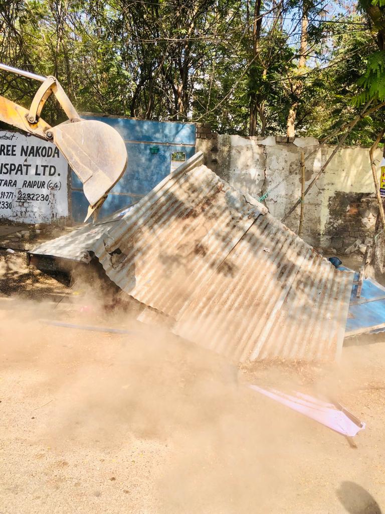 छत्तीसगढ़ / 20 फरवरी 2023 / बिलासपुर :- इन दिनों शहर में बेजा कब्जा धारियों पर नगर निगम की कार्यवाही लगातार चल रही है इसी कड़ी में आज सोमवार को नगर निगम का एक अमला सरकंडा क्षेत्र के एसईसीएल ऑफिस रोड पर अवैध कब्जा किए पान ठेला व गुमटीओ पर कार्यवाही करते हुए तोड़ दिया गया है सड़क के किनारे बेजा कब्जा धारियों की वजह से यातायात प्रभावित होती जा रही है जिसे नियंत्रित करने के लिए सड़क के किनारे अवैध रूप से लगे दुकानों व ठेलों पर निगम द्वारा सख्त कार्यवाही करते हुए तोड़ दिया गया है। कार्यवाही के दौरान काफी भीड़ हो गई थी लेकिन विरोध के बीच भी निगम के अधिकारियों ने जेसीबी लगाकर सभी बेजाकब्जा धारियों के दूकानों को तोड़ दिया है।