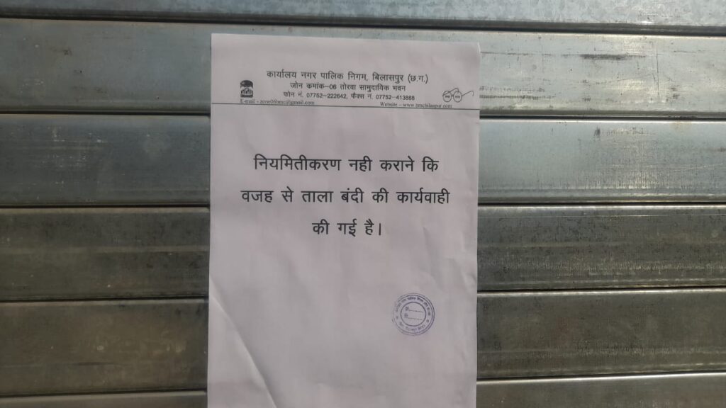 छत्तीसगढ़ / 03 मार्च 2023 / बिलासपुर :- गणेश नगर चुचुहिया पारा वार्ड 46 में त्यौहार से पहले नगर निगम का अमला कार्यवाही करते हुए वार्ड में संचालित 18 दुकानों को ताला मारकर सील कर दिया है। निगम के अधिकारियों ने दुकानों का नियमितीकरण न करवाने का हवाला देते हुए यह कार्यवाही किया है उन्होंने यह भी बताया कि मकान बनाने की अनुमति लेकर दुकान बनवा लिया गया है। अधिकारियों ने यह भी कहा कि व्यवसायिक करण के प्रावधानों के अनुसार इन्हें नियमितीकरण करवाना था जो कि बार बार नोटिश देने पर भी नियमतिकरण नही करवाये जिस वजह से दुकानों को सील करना पड़ा है।