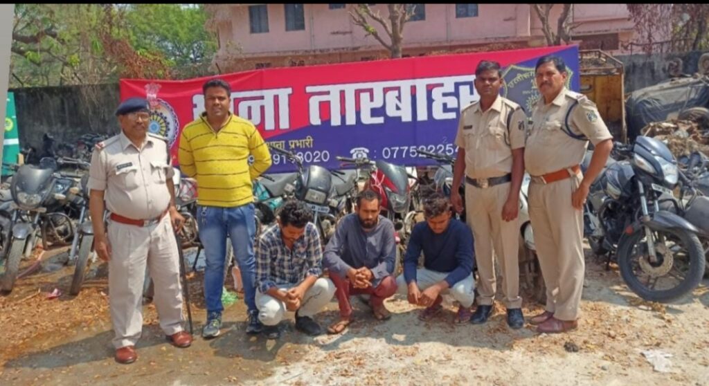 आरोपी इतियल, अनिल और संगम के द्वारा चोरी का बाइक को बहुत कम दाम में बिक्री करने के लिये ग्राहक की तलाश करने की सूचना पर ACCU और थाना तारबाहर पुलिस टीम द्वारा रेड किया गया आरोपियों के पास 4 पल्सर, 3 डीलक्स, 2 स्प्लेंडर, 1 एक्टिवा, 1 सीबीजी मोटर साइकल मिली, उक्त मोटर साइकल रखने के संबंध में आरोपियों को नोटिस दिया गया, तीनो आरोपियों ने कोई भी दस्तावेज नही होना लिखित में दिया, इन मोटरसाइकिल में CG 22, CG 11, CG10 RTO पासिंग हैं, उक्त मोटरसाइकिल की और जानकारी प्राप्त कर वास्तविक वाहन स्वामियों का पता किया जा रहा है। उपरोक्त बाइक को चोरी की संपत्ति होने की युक्तियुक्त संदेह पर आरोपियों के कब्जे से गवाहों के समक्ष मुताबिक जप्ती पत्रक के जप्त किया गया और धारा सदर 41 (1-4) जाफौ/379 भादवि के अंतर्गत आरोपियों इतियल पीटर पिता पीटर मशीह उम्र 28 वर्ष निवासी कस्तूरबा नगर सिविल लाइन बिलासपुर,अनिल पांडे पिता स्वराज पांडे उम्र 30 वर्ष निवासी पारिजात कॉलोनी सिविल लाइन बिलासपुर व संगम मानिकपुरी पिता दुखीराम मानिकपुरी उम्र 20 वर्ष निवासी दैजा तखतपुर को गिरफ्तार कर माननीय न्यायालय के समक्ष प्रस्तुत किया गया जिन्हें न्यायिक रिमाण्ड पर जेल भेजा गया है।