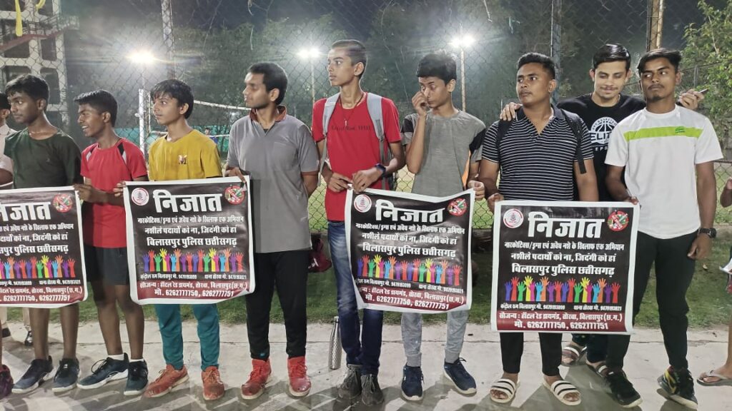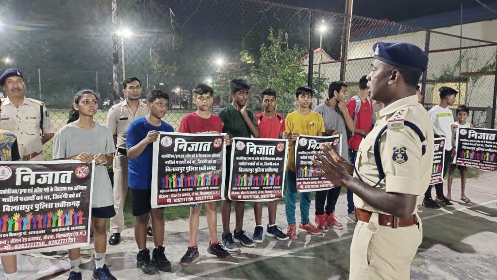 छत्तीसगढ़ / 11 अप्रैल 2023 / बिलासपुर :- जिले के पुलिस अधीक्षक संतोष सिंह द्वारा चलाये गए नशे से निजात अभियान का जादू लोगों के बीच तेजी से चल रहा है, जगह जगह लगी पोस्टर बैनर लोगों को नशा नही करने के लिए प्रेरित कर रही है। इसी कड़ी में तोरवा थाने के टीआई सुनील तिर्की भी नशा से निजात अभियान के तहत रेल्वे क्षेत्र के सड़को में पद भ्रमण कर लोगों को नशे से दूर रहने की नसीहत दे रहे है। सोमवार को रेल्वे खेल मैदान नार्थ ईस्ट इंस्टिट्यूट में तोरवा टीआई सुनील तिर्की अपने अधीनस्थ कर्मचारियों आरक्षक सुनील सिंह सहित अन्य के साथ पहुँचकर मैदान में बॉलीबाल खेल रहे खिलाड़ियों को भी नशे से निजात अभियान का सहयोग कर नशे से दूर रहने की अपील किया जहाँ खिलाड़ियों ने इस अभियान की प्रशंसा करते हुए एक स्वर में इस अभियान में सहयोग करने की बात कहे है।