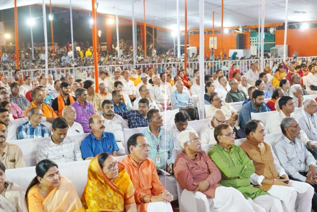 उन्होंने कहा कि कोई भी विकृति जब चरम सीमा पर पहुंचती है तो संस्कृति का मार्ग प्रशस्त होता है चिंता व्यक्त करते हुए कहा कि विकास के नाम पर अंधाधुंध कार्य हो रहे हैं, इससे चंद्रमा की सतह भी धस गई है . उन्होंने स्पष्ट कहा कि हम विकास के विरोधी नहीं है , लेकिन प्रकृति के नियमों को साथ लेकर विकास होना चाहिए. उन्होंने कहा कि पृथ्वी के धारक तत्वों की विकृति और विलुप्प्ती ही विकास की परिभाषा बन गई है. उन्होंने पृथ्वी के साथ धारक तत्व बताते हुए कहा कि इन भारत तत्वों को बिना नुकसान किए ही विकास किया जाना चाहिए. उन्होंने गोवंश की रक्षा पर करते हुए कहा , कि मुझे छत्तीसगढ़ में गायों के झुंड का एक साथ बैठना बहुत अच्छा लगता है, क्योंकि यही वास्तव में गोष्ठी कहलाती है. उन्होंने यह भी कहा कि चारों दिशाओं में 25-25 एकड़ भूमि गोचर भूमि सुनिश्चित करनी चाहिए. जिससे कि गोवंश की रक्षा हो. उन्होंने आदर्श व्यापार के संबंध में कहा कि व्यापार में धर्म का पालन नहीं हो पाता . श्रीमद् भागवत कथा में कहा गया है, कि अर्थ के गर्भ से अनर्थ उत्पन्न होता है. इसलिए इसे सावधान रहना चाहिए. उन्होंने कहा कि शराब और जुए से व्यक्ति को दूर रहना चाहिए. सुबह उन्होंने बिलासपुर के तिफरा स्थित झूलेलाल मंगलम में सम्मानित धर्म प्रेमियों और आस्थावान श्रद्धालुओं को बड़ी संख्या में दीक्षा प्रदान की। इस अवसर पर स्वामी ऋषि ब्रह्मचारी जी स्वामी निर्विकल्पानंद जी महाराज नगर विधायक शैलेश पांडे, बिलासपुर सांसद अरुण साव, तखतपुर विधायक रजनीश सिंह, विधायक रजनीश सिंह पूर्व मंत्री अमर अग्रवाल, अभय नारायण राय, चंद्रचूड़ त्रिपाठी, संदीप पांडे, विधायक धर्मलाल कौशिक कांग्रेस नेता राजेंद्र शुक्ला, सियाराम कौशिक, प्रमोद नायक विवेक बाजपेई, डॉक्टर मखीजा डॉ विनोद तिवारी, सिंधी समाज के प्रमुख साईं लाल दास जी सहित चंद्रचूड़ त्रिपाठी, प्रफुल्ल शर्मा, सुनील दीक्षित , अभिषेक पांडे , अमित जायसवाल एल्डरमैन, पार्षदगण, पी एन बजाज, हरीश भगवानी, मोतीलाल गंगवानी, मोहनलाल मोटवानी, जगदीश, श्याम हरियानी, गोपी थारवानी, बृजलाल नागदेव, महेश पमनानी, सुरेश सिदार, आनंद देसर, लालचंद लालवानी, पीएन खत्री, रामचंद्र नागवाणी राधा-कृष्ण नामदेव सतीश तहलियानी, आनंद वाहिनी आदित्य वाहिनी के समस्त पदाधिकारी सहित बड़ी संख्या में श्रद्धालु उपस्थित थे..